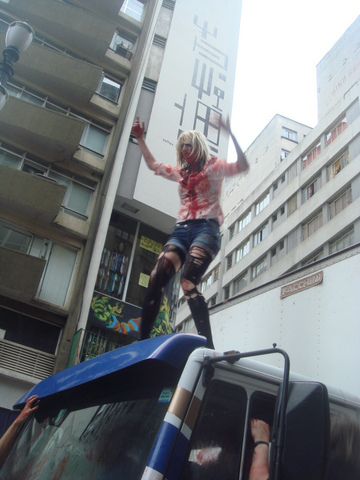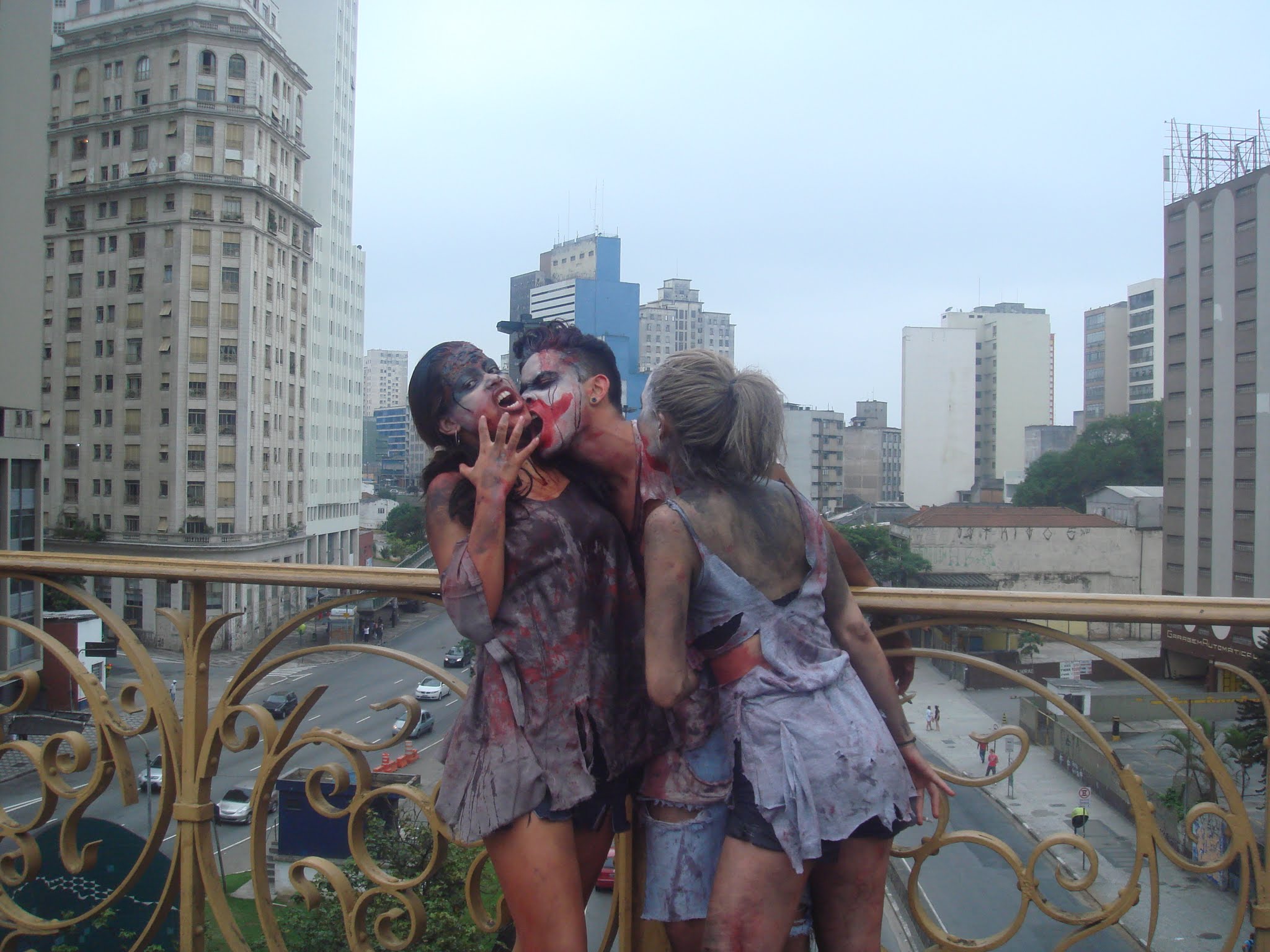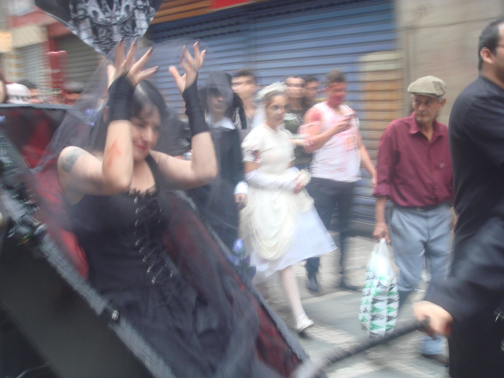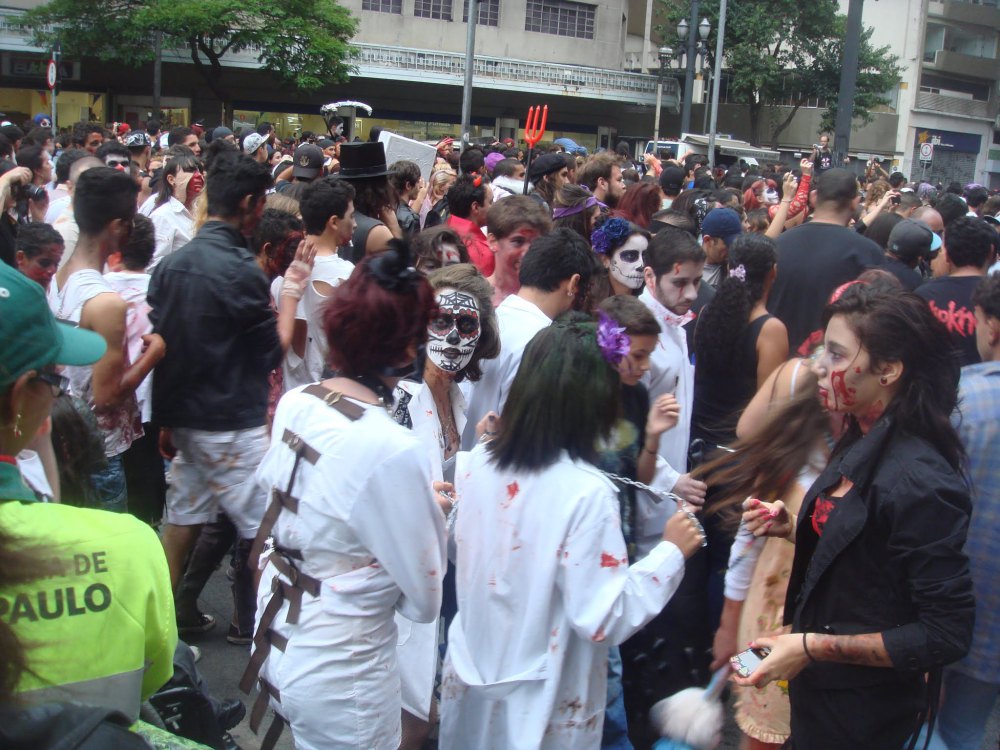 Alors que certains arpentent encore en France les petits chemins de terre pour fleurir la tombe de Grand-Mère, point de gerbes de houx vert ni de bruyère en fleur dans les cimetières de São Paulo. Beau compromis entre fête des morts et fête des vivants, les paulistes célèbrent les morts-vivants le 2 novembre. Pas le moindre lien avec Halloween dans cette fête impie, il s’agit d’une parade durant laquelle une marée morte-humaine remonte les rues de la ville le temps d’un après-midi. Entre 5 et 10 000 « zombies » bravent ainsi le soleil et exposent en pleine lumière leur maquillage digne des meilleurs films d’horreur ou, lorsque ce n’est pas le cas, leurs vêtements et leurs mains modestement recouverts de sang factice.