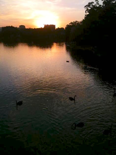 Sinon, samedi, lorsque nous nous baladions dans le parc d’Ibirapuera avec H. et N., nous avons remarqué un aspect important de l’homo brésilicus : le culte du corps et du torse-nu. Le week-end, tous les paulistanos (les personnes originaires de la ville de Sao Paulo alors que les paulistas sont seulement originaires de l’Etat de Sao Paulo) sont en tenue de sport. Pas d’exception. Et dès que l’on passe les grilles du parc Ibirapuera bondé de joggers, cyclistes, skateurs et marcheurs, plus un seul homme n’a de t-shirt. Pour des européens, la scène est complètement ridicule : ça roule des pectoraux de partout. Ils sont tous parfaitement bodybuildés et épilés. Pour ne pas choquer les meilleurs d’entre nous je mettrai juste une photo de coucher de soleil sur le parc depuis le petit pont.