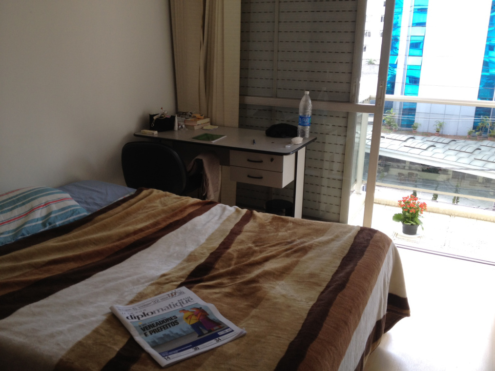 Une petite photo de ma chambre. On remarquera le Monde Diplomatique (en portugais) et le mignon petit balcon. Celui-ci alterne, comme toute la ville, entre ombre et soleil à cause du nombre de gratte-ciel et parce que le soleil est bas sur l’horizon en cet hiver brésilien.