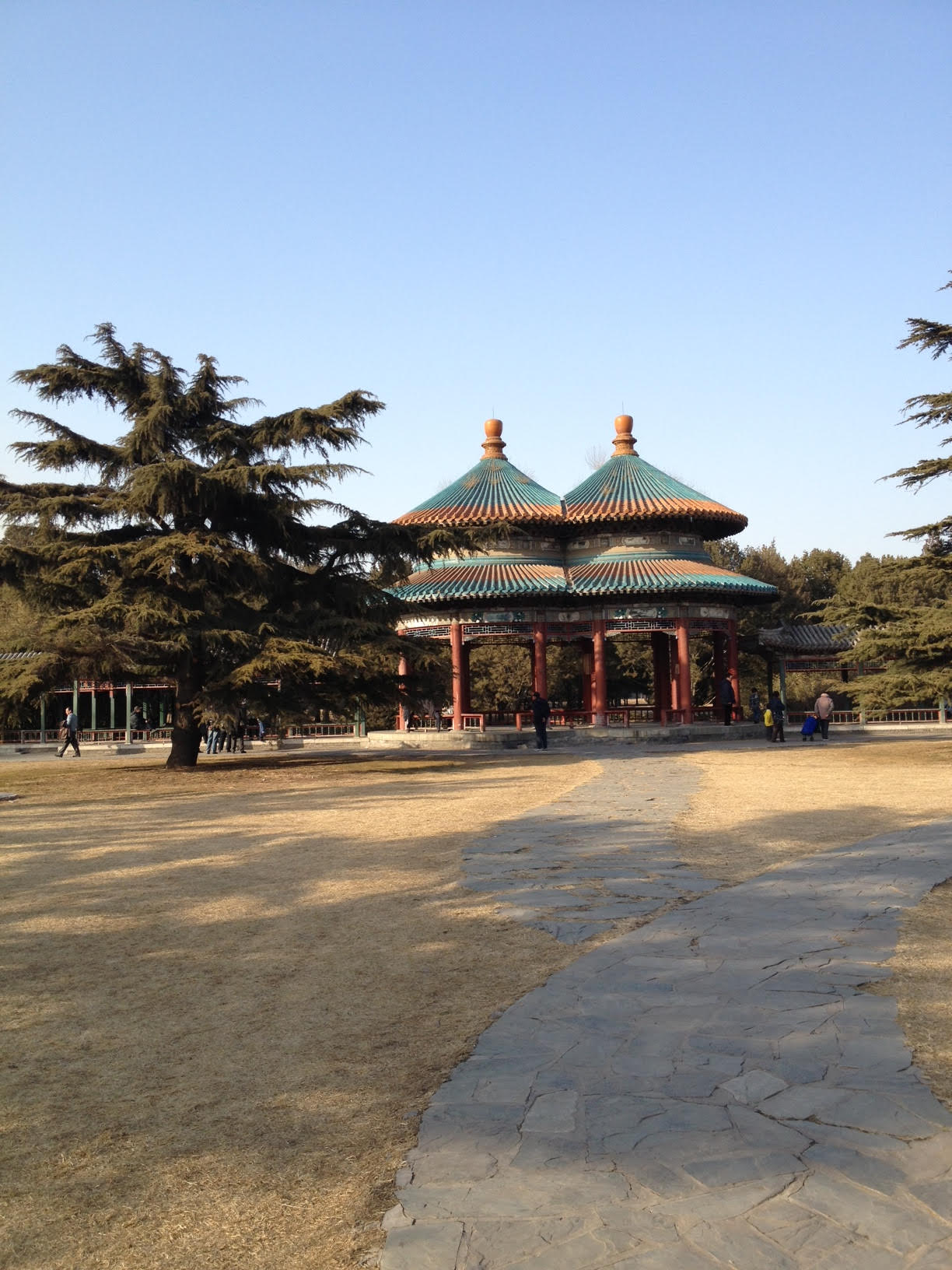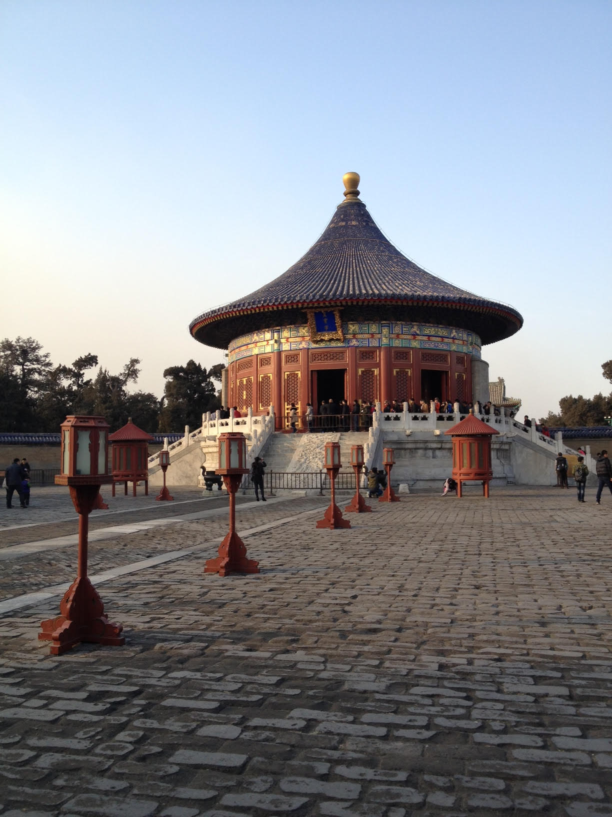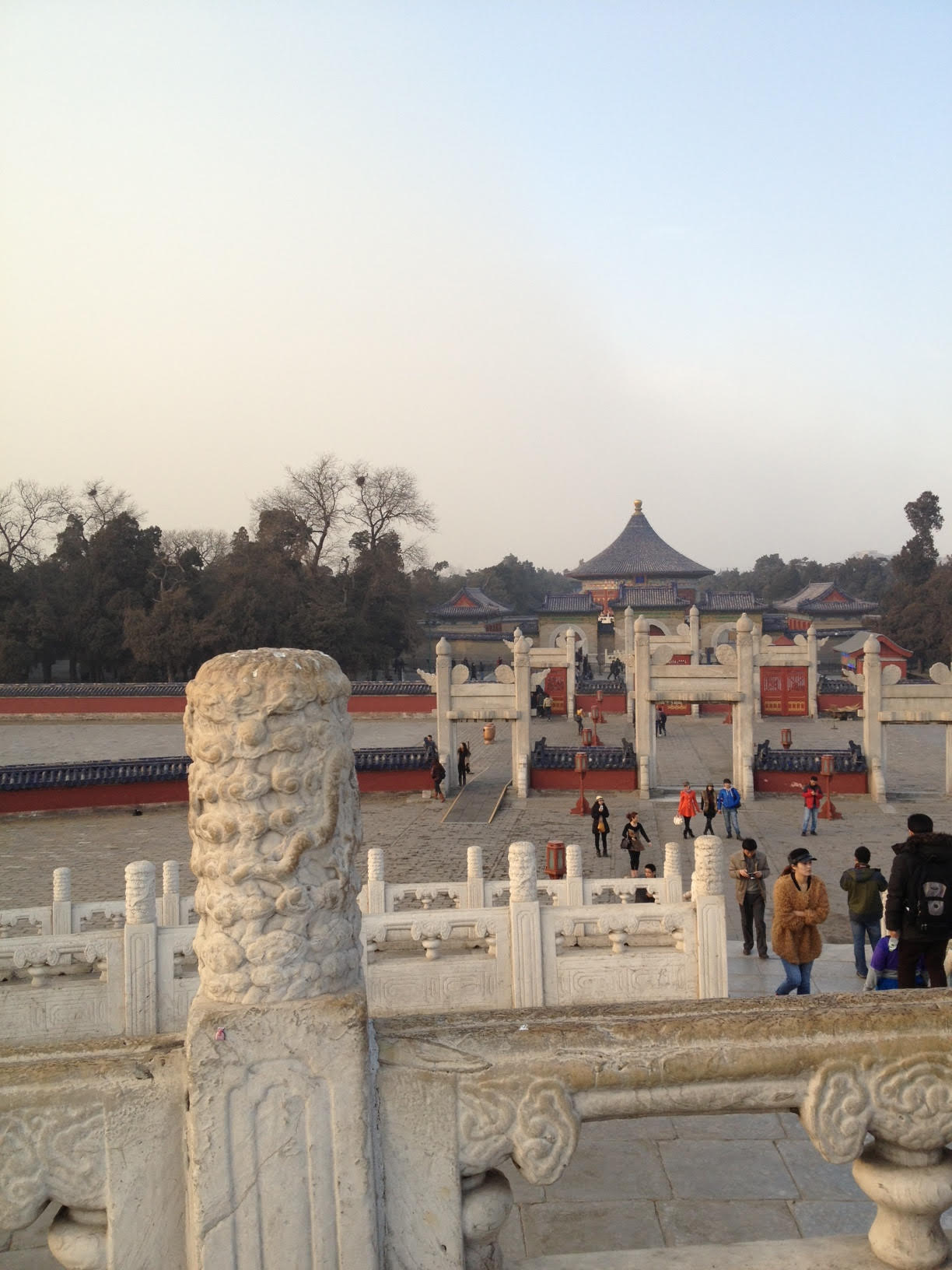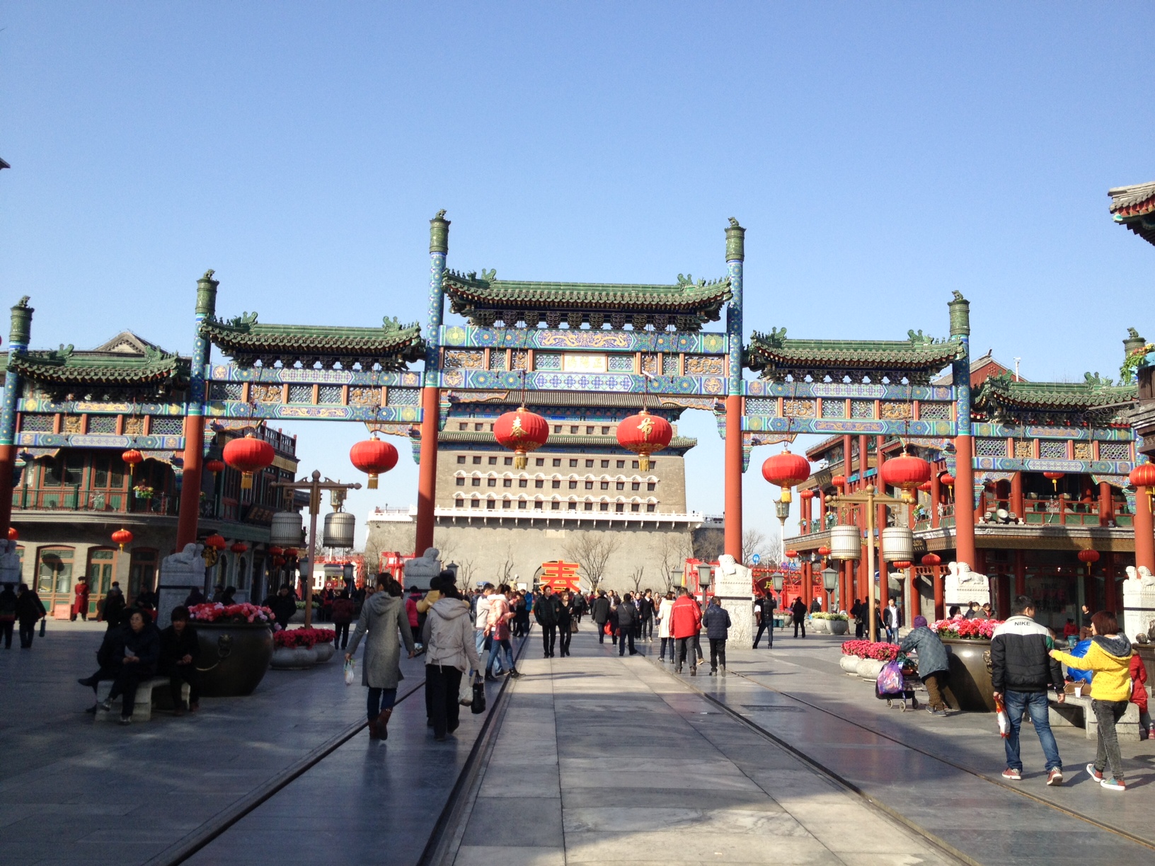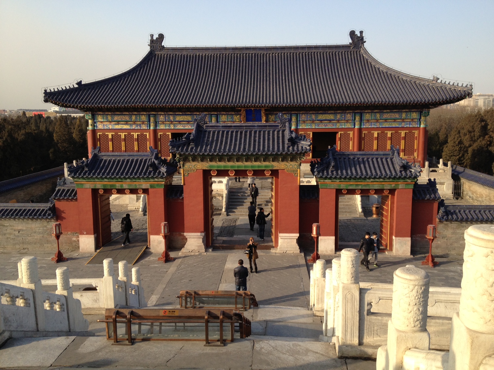 Retour à Tien'anmen, au sud de la place cette fois-ci, d'où descend une avenue, véritable pendant de Disneyland avec ses hordes de touristes asiatiques et ses enseignes (de Rolex à une boutique de contrefaçons Lacoste) dans des magasins aux chinoiseries trop surfaites pour être d'époque. Sorti de ce décor Potemkine, on se retrouve dans un bon vieux hutong avec un poulailler d'oies et de coqs (en plein Pékin). Enfin l'on pénètre le parc Tiantan qui abrite les temples où l'Empereur venait exécuter les rites de la cosmologie chinoise (prières pour avoir de meilleurs moissons, etc.).