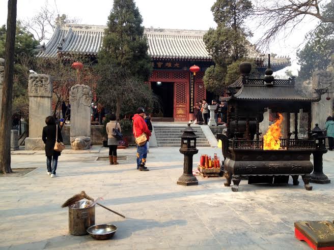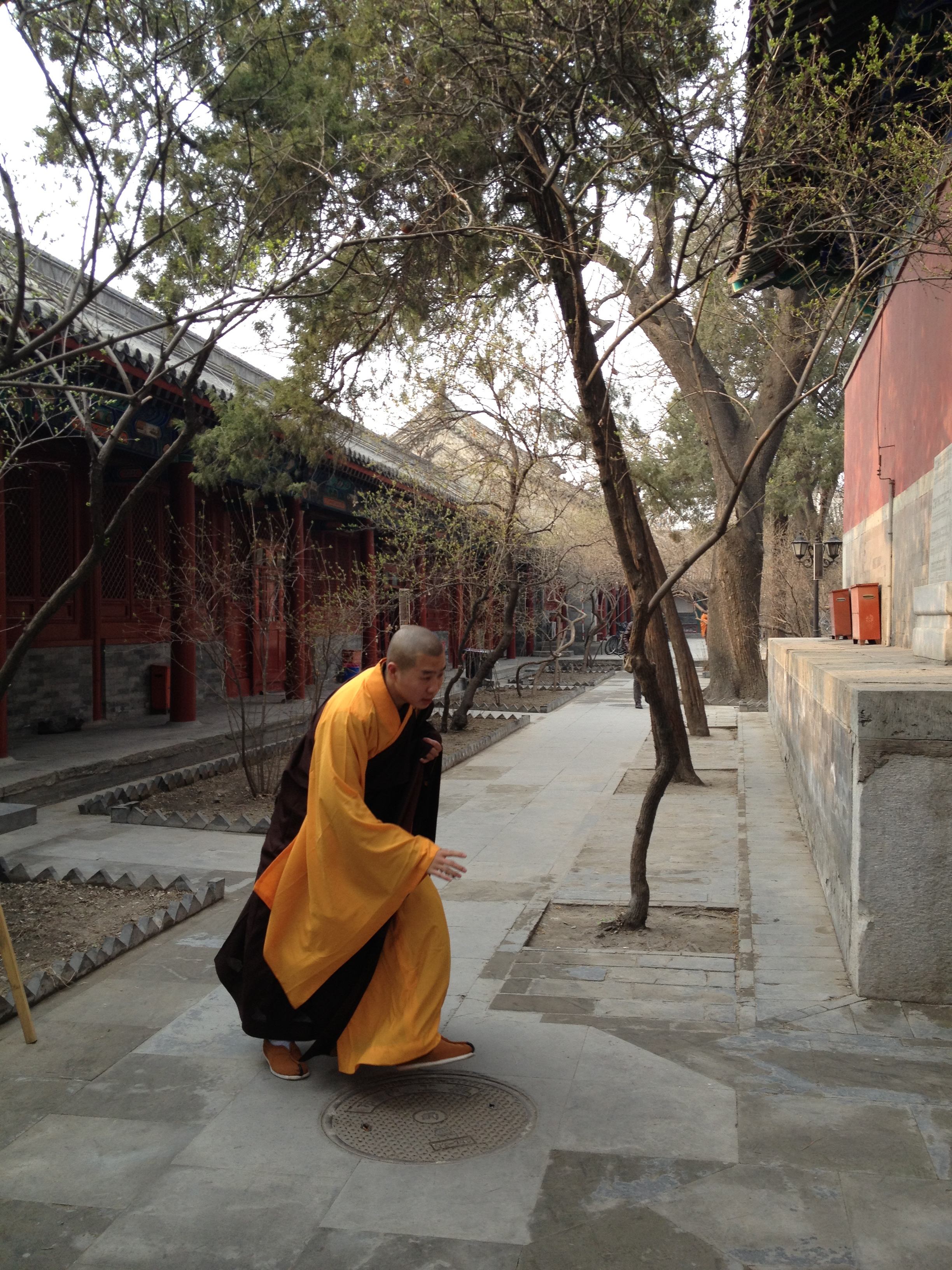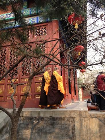 Jugeant le Carême trop inhumain pour qui est condamné au régime chinois, j'ai profité de la semaine sainte pour faire un parangonnage (oh oui, c'est le mot français pour "benchmark") des autres religions à ma disposition ici. Je me suis donc rendue dans l'un des plus vieux temples bouddhistes de Pékin (645 ap. J-C.), Fǎyuán Sì (le temple de la source de la loi). J'arrivai à l'heure de la fermeture (sans plan, j'avais erré dans les rues pour le trouver) et m'apprêtai à chanter mes suppliques au gardien pour pouvoir entrer quand même mais, par chance, se tenait ce soir-là une cérémonie avec une trentaine de moines chanteurs !