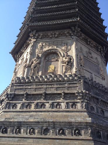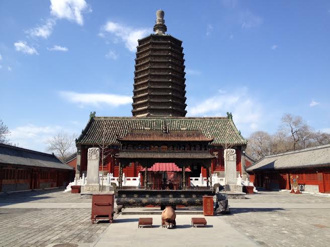 Une autre curiosité de la ville, la pagode millénaire du temple Tianning qui, comme presque tout le reste, a été détruite dans le passé mais dont la reconstruction la plus récente remonte au tout début du XIIème siècle ! Et elle tient bon, cerclée de hutongs. Les statuettes l'ornant ont toutefois été décapitées bien entendu et les temples environnants rebâtis plusieurs fois. Cette pagode bouddhiste frappe par son style qui la démarque de tout ce que l'on peut voir à Pékin, par son matériau de construction (de la pierre et non pas du bois comme d'ordinaire !) ainsi que par l'air belliqueux de ses gardiens de pierre.