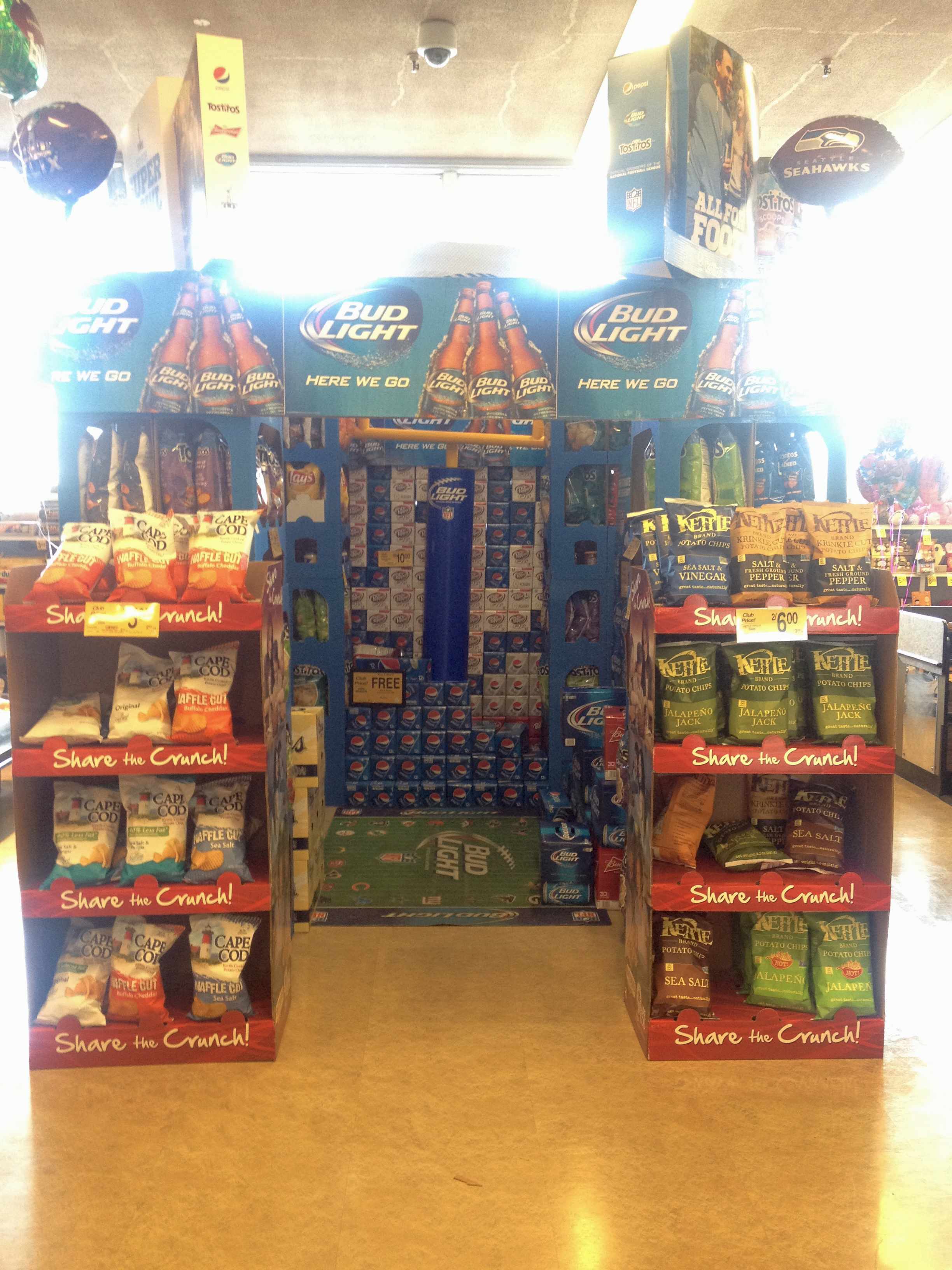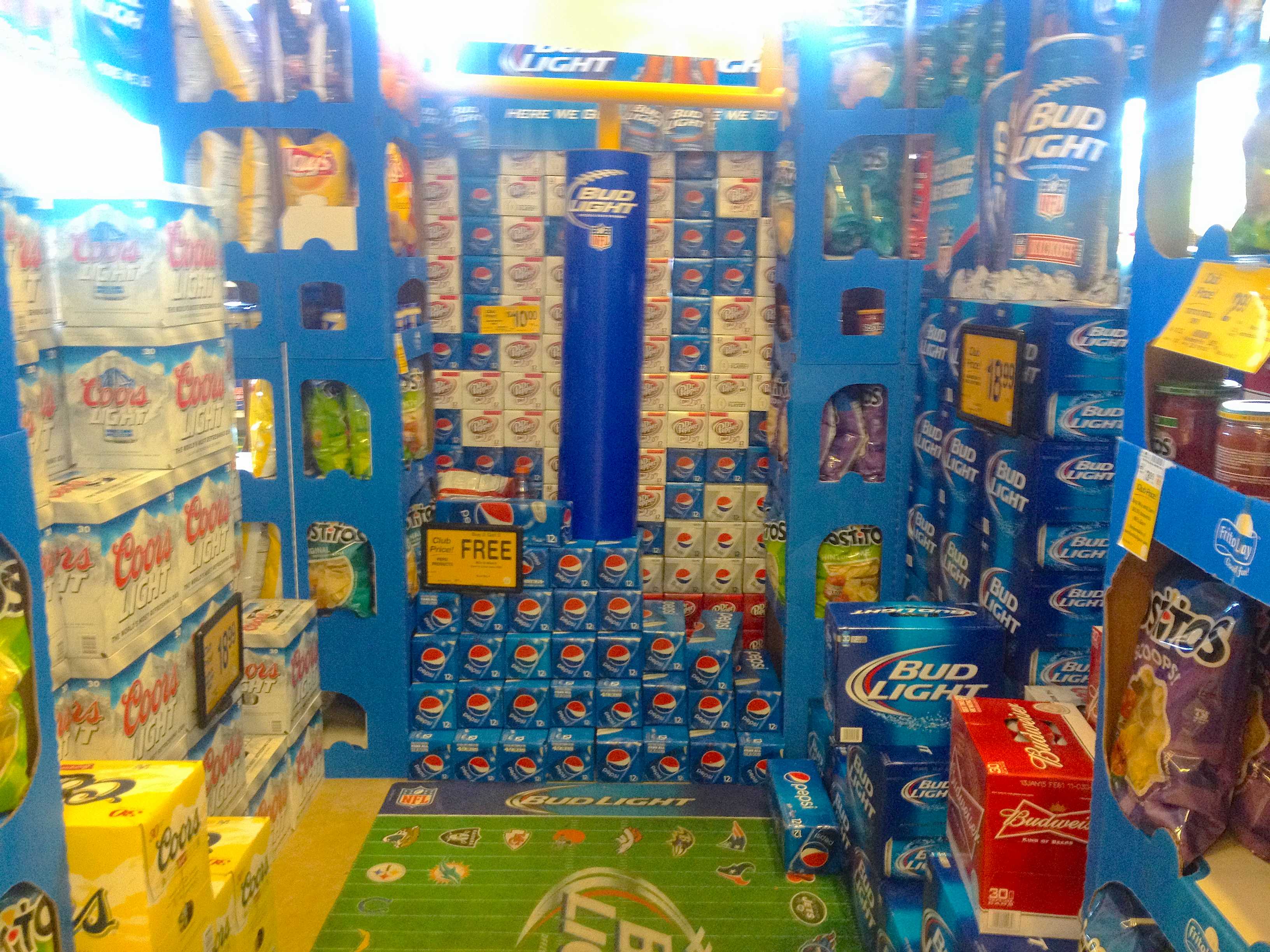 Superbowl oblige, une sculpture de packs de bières, de sodas et de paquets de chips s'élevait à l'entrée du supermarché. Il semble que les pharmacies ne vendent pas encore d'alcool à moins de 50 degrés, sinon je ne doute pas qu'elles profiteraient de la manne de la finale du championnat de football américain elles aussi.