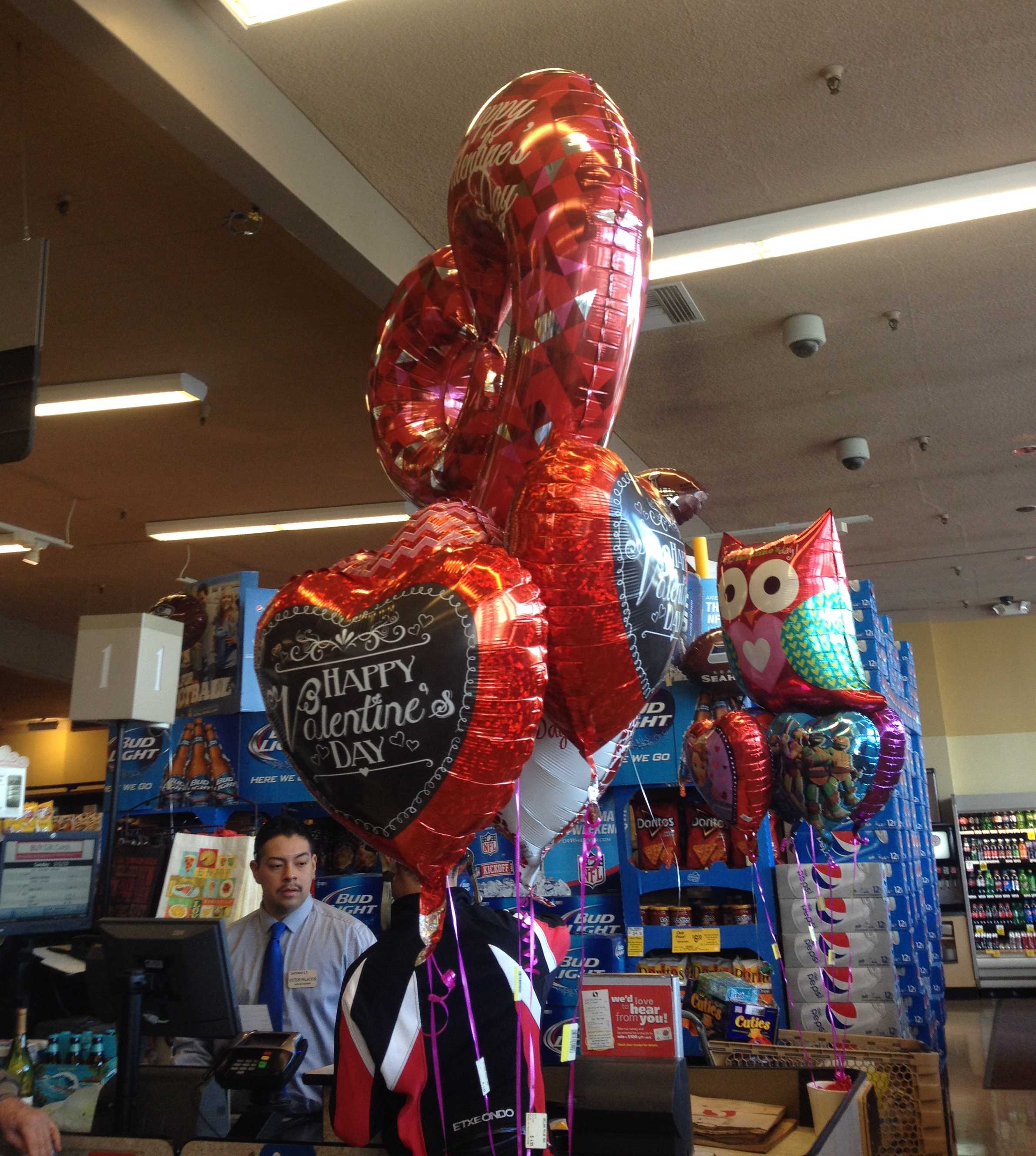 Ballons Saint-Valentin à la caisse du Safeway, rayons de cartes et chocolats dans des parapharmacies
