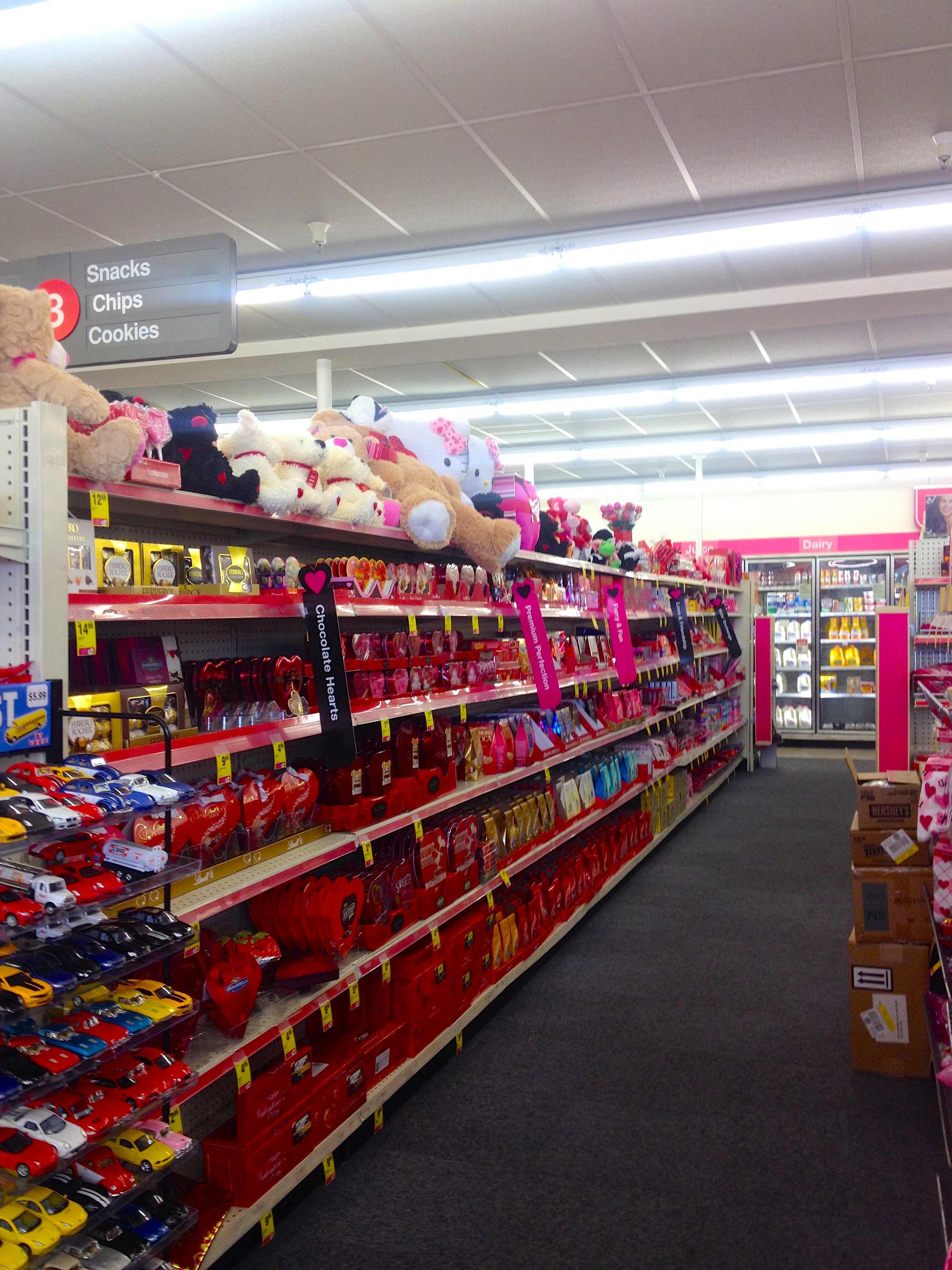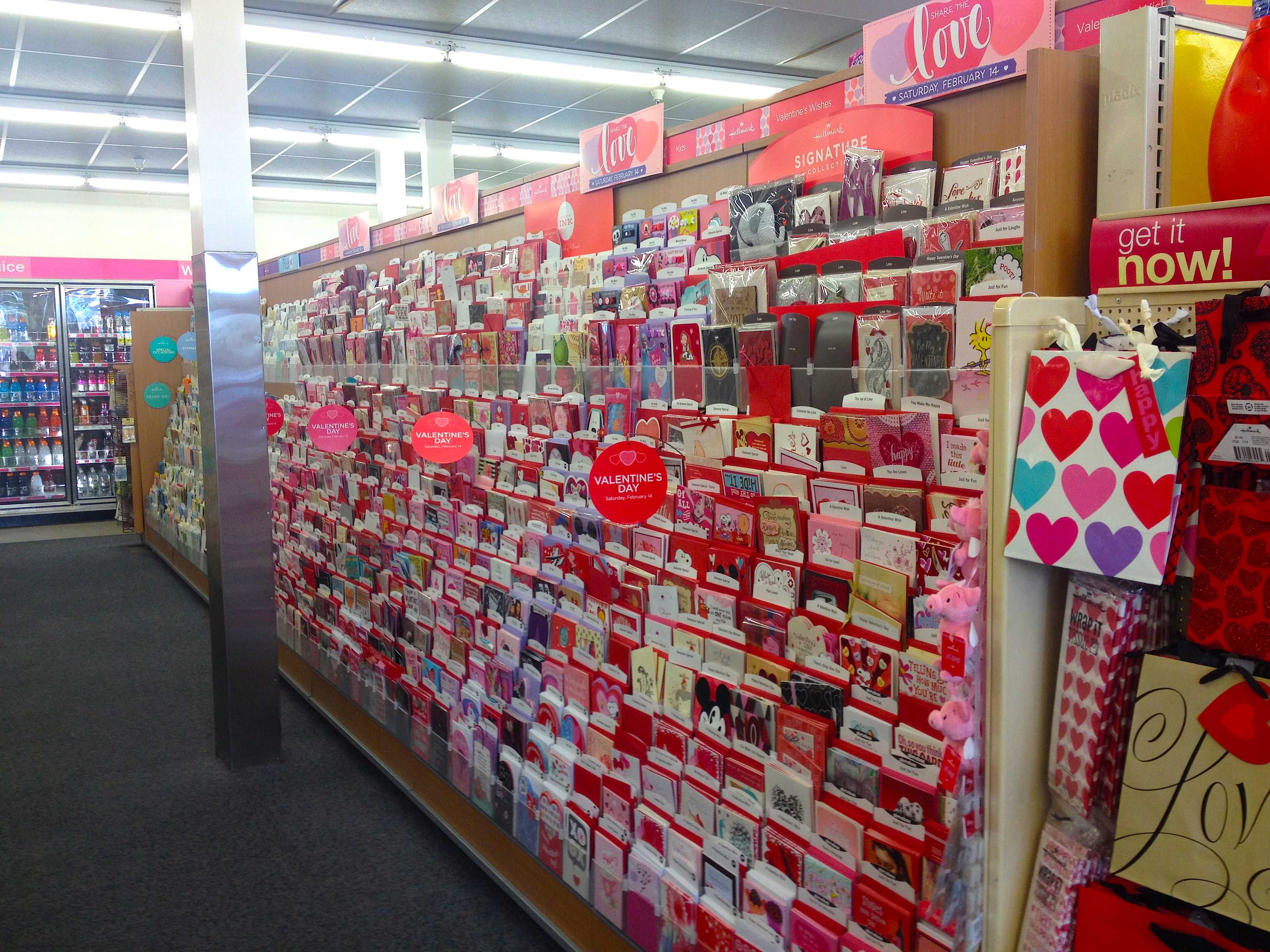 Je n'ai pas encore visité le temple suprême de la consommation qu'est le Walmart mais j'ai fait un Safeway (~Carrefour) et des CVS Pharmacy et Walgreens (~Boots en Angleterre, sortes de parapharmacies gigantesques où l'on vend plein de choses sans rapport avec la santé). A deux semaines de la Saint Valentin, des rayons entiers de cartes, de chocolats et de fleurs s'étendent sur des dizaines de mètres.