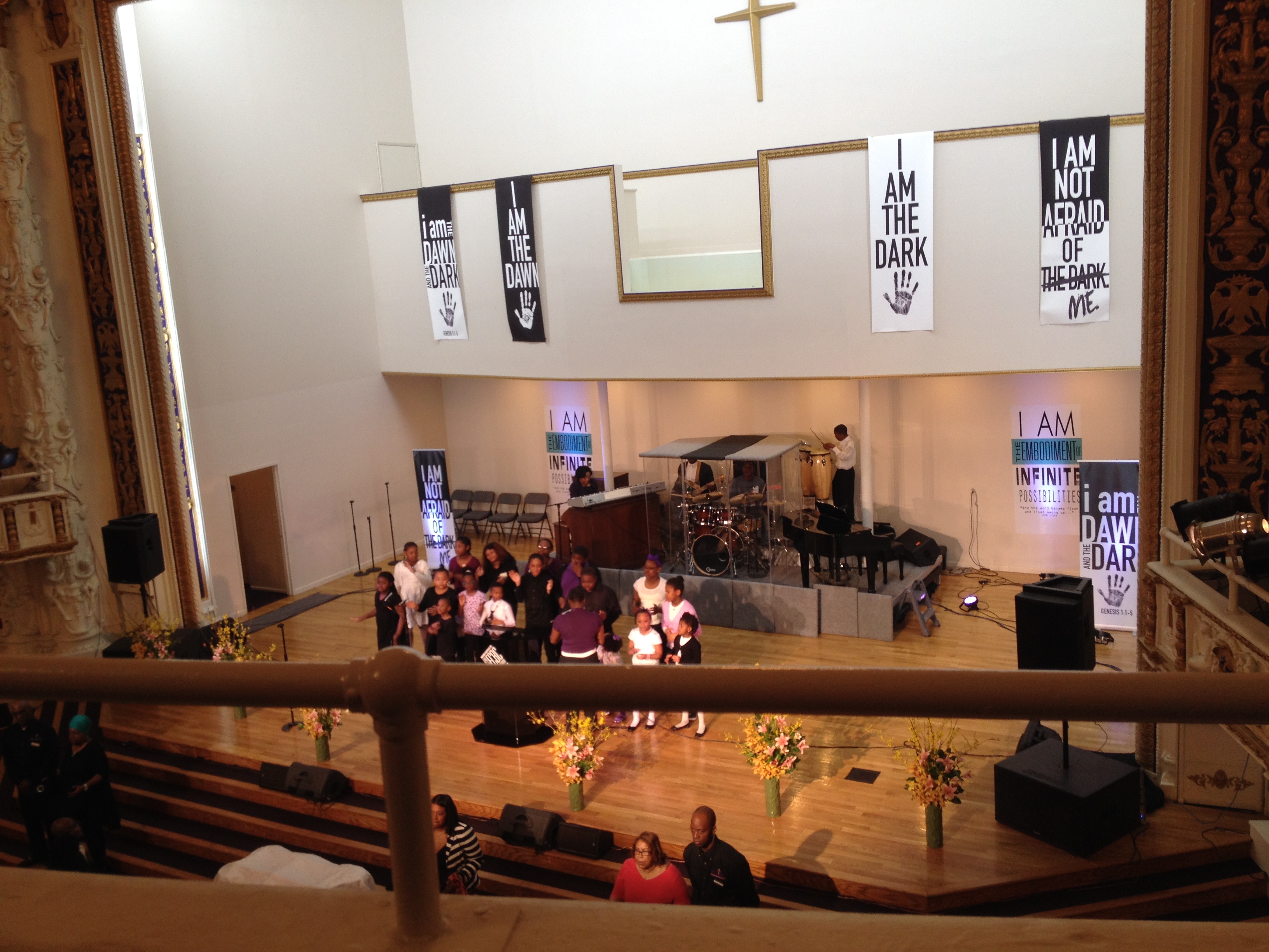 La messe baptiste dans une des plus grandes églises de Harlem était incroyable. D'abord il y a avait la foule : que des noirs tandis que les touristes étaient tous blancs (nous avons pu nous asseoir avec les fidèles et pas avec les touristes qui étaient relégués au fond du balcon supérieur en ce qui nous concerne). Les gens avaient clairement fait un effort vestimentaire : les femmes arboraient toutes des talons interminables avec plateformes, des mini-robes moulantes, des paillettes, des faux-cils, etc. L'église ressemblait à une salle de spectacle avec une grande estrade, un balcon et des fauteuils de théâtre. Tout a commencé par une pasteur (il n'y avait que des femmes qui ont prêché ce jour-là) qui scandait au micro "God, we love you. God, if you can hear us, we love you, we love you, we love you!". Quelques personnes étaient debout et levaient leurs mains. Il y eut du gospel (malheureusement nous avons eu la chorale des enfants ce jour-là mais c'était chouette quand même et les musiciens étaient très bons) puis le moment du sermon est arrivé.