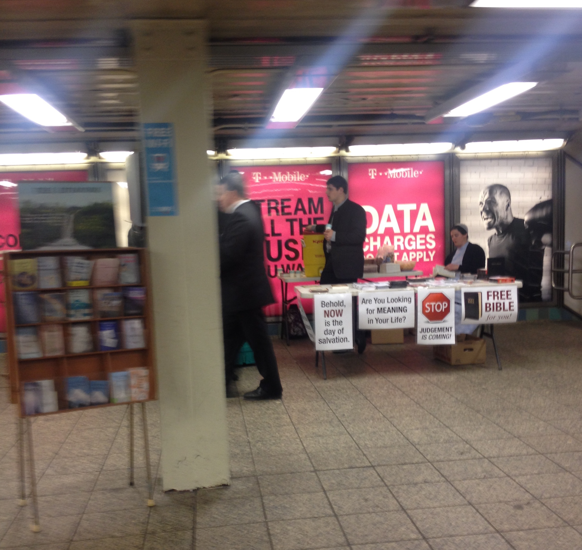 Dans le métro, j'ai aussi vu des chorales de chanteurs religieux (tous blancs ceux-là et avec des jupes longues de grands-mères) qui avaient des panneaux "Free Bible" ou "Judgement is coming!" pour attirer des fidèles. La religion, c'est tout dans le marketing ici.