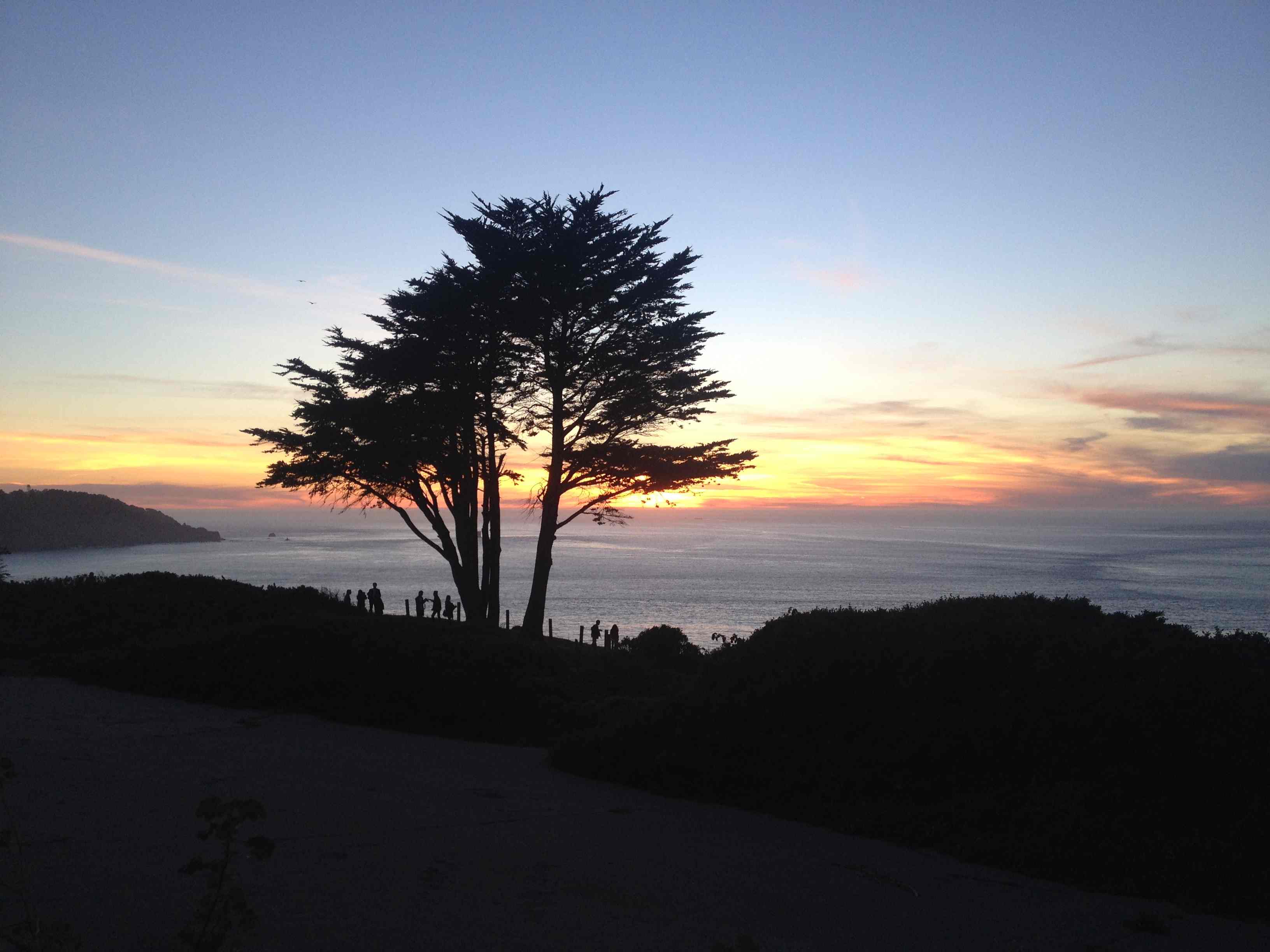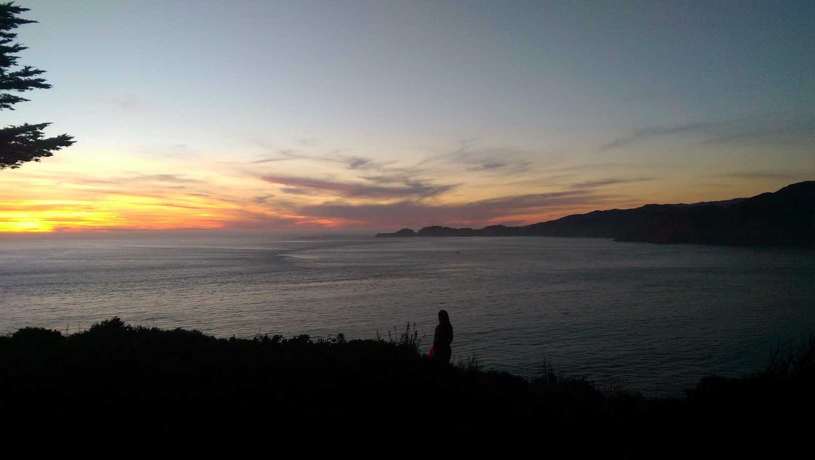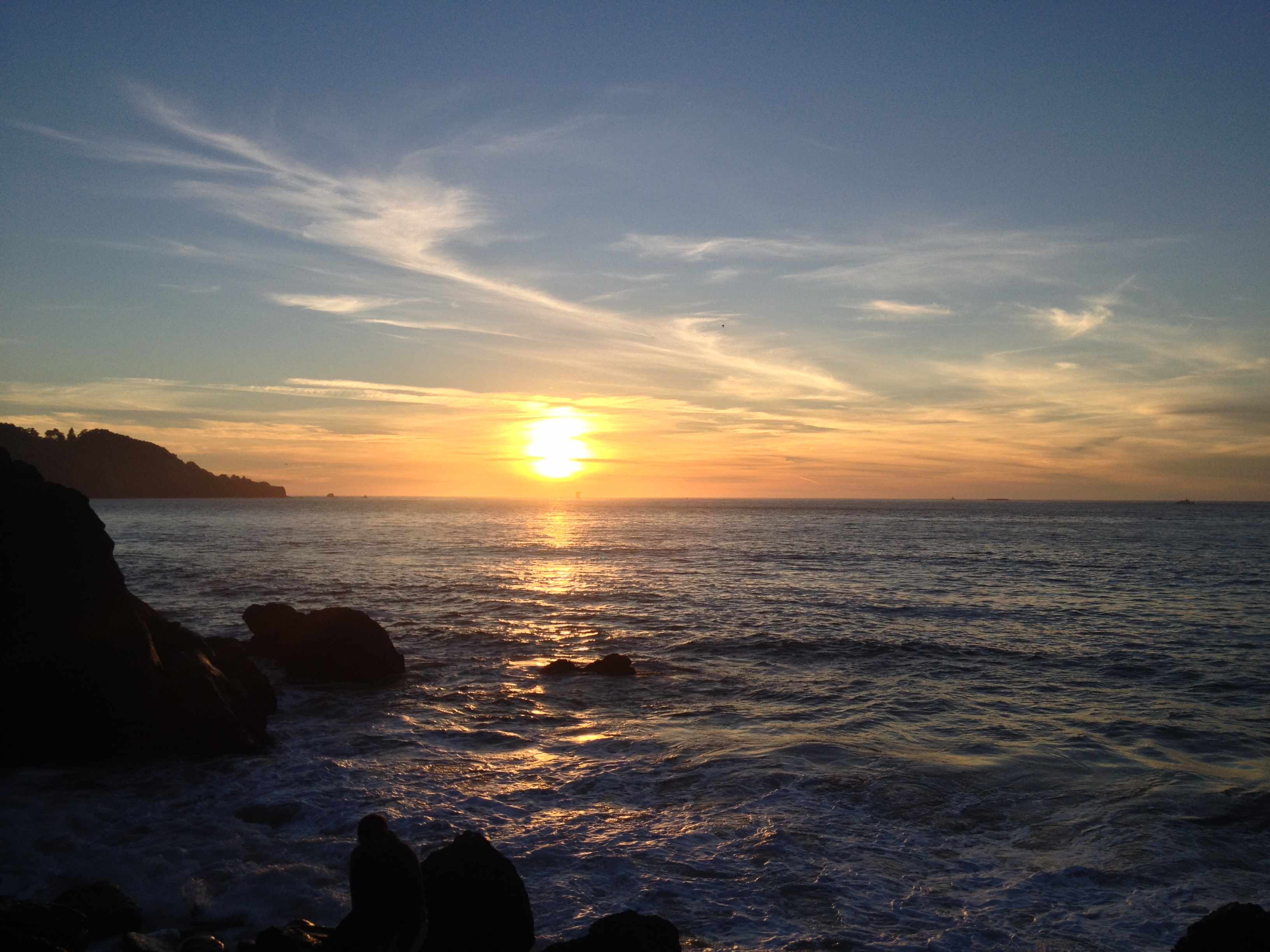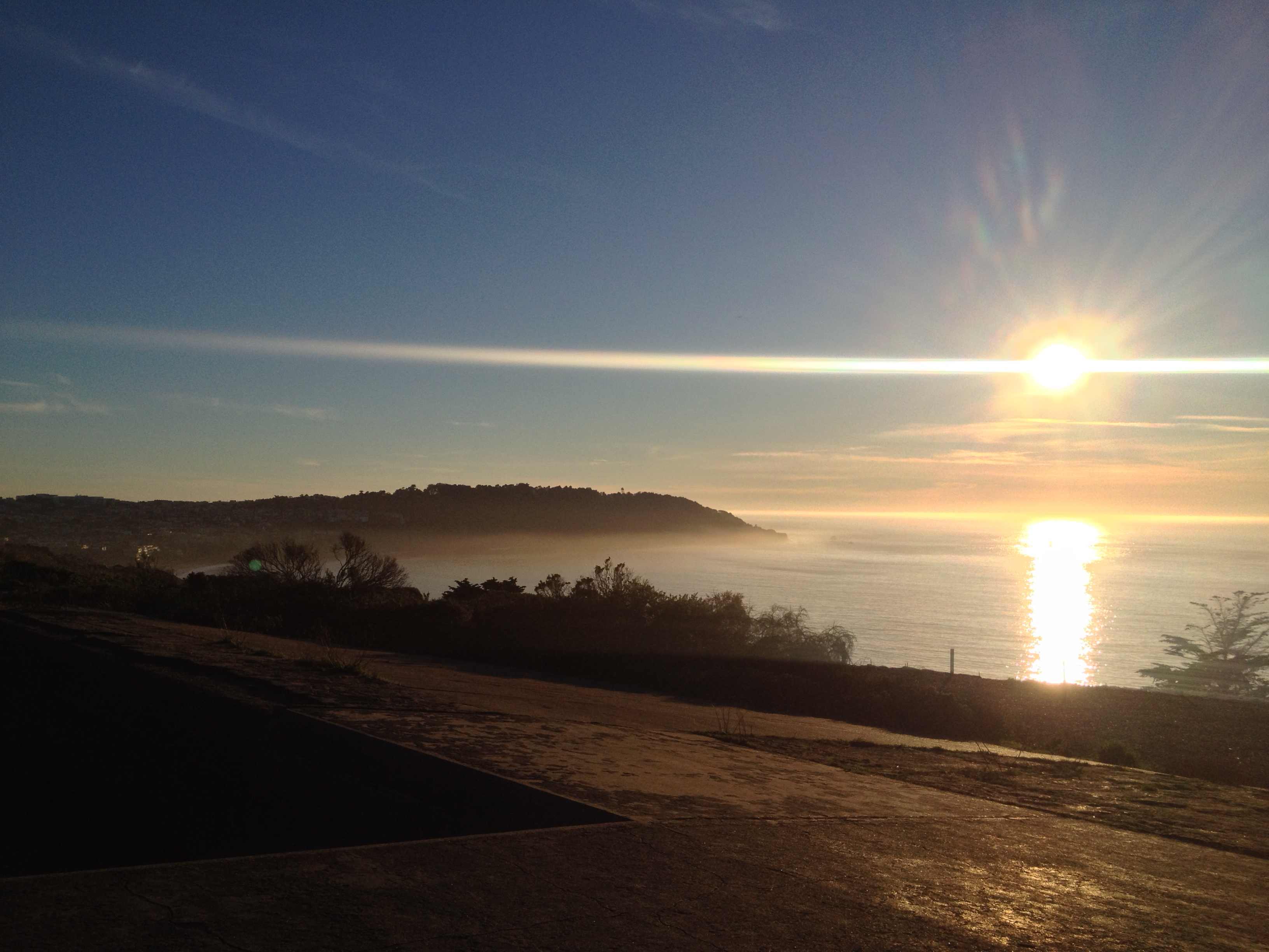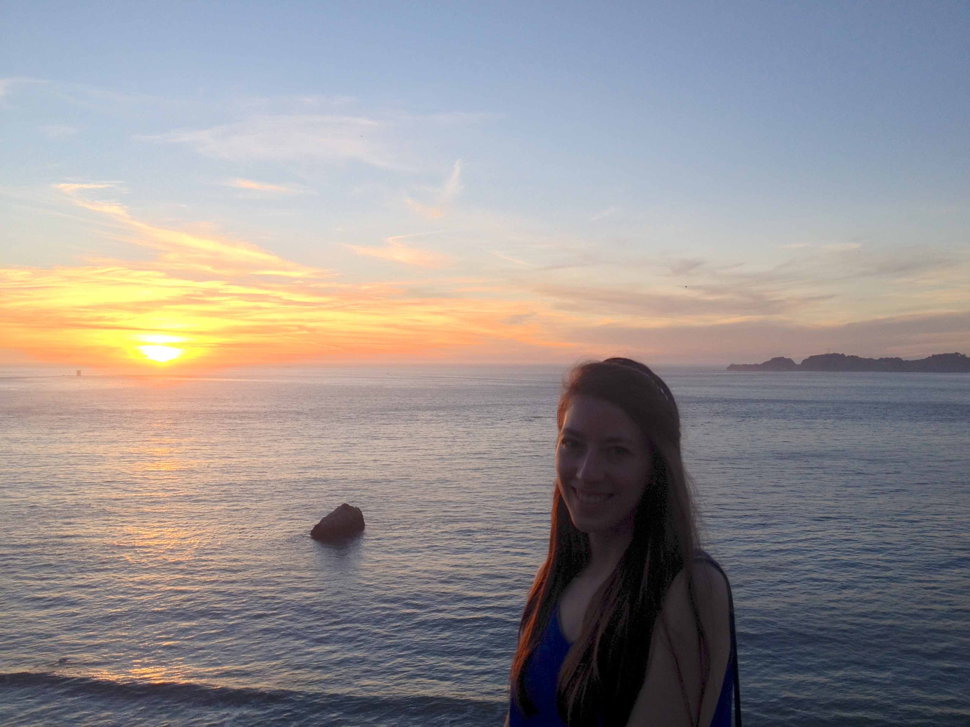 R et moi avons admiré un superbe couché de soleil depuis la plage côté océan avec le pont se profilant au loin.