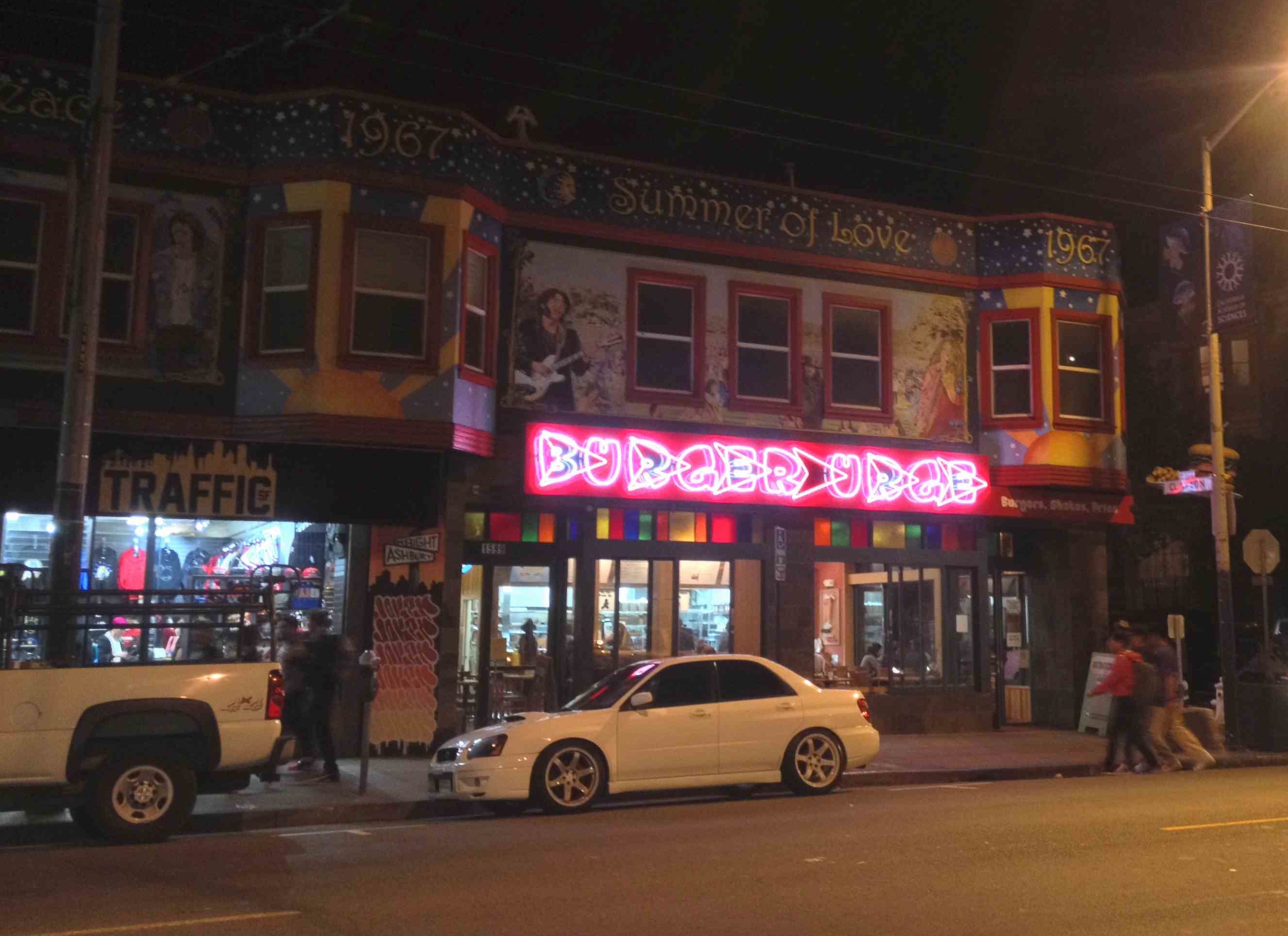 Estimant toutefois que nous avions dépassé notre quota de miel en ce jour de la Saint Valentin, nous sommes allés nous empiffrer chez Burger Urge - un restaurant de burgers comme son nom l'indique si bien - dans le quartier de Haight-Ashbury. L'occasion de constater que l'âme hippie de la ville est encore bien présente : plein de petits caucasiens avec des cheveux sales et longs, des dreadlocks, de longues jupes, des guenilles, des piercings et qui font du cerceau. On trouve aussi des punks dans ce quartier et quelques afro-américains avec des t-shirts de basketball, des casquettes et des boucles d'oreilles. Mon impression générale d'SF est que cohabitent deux populations : les