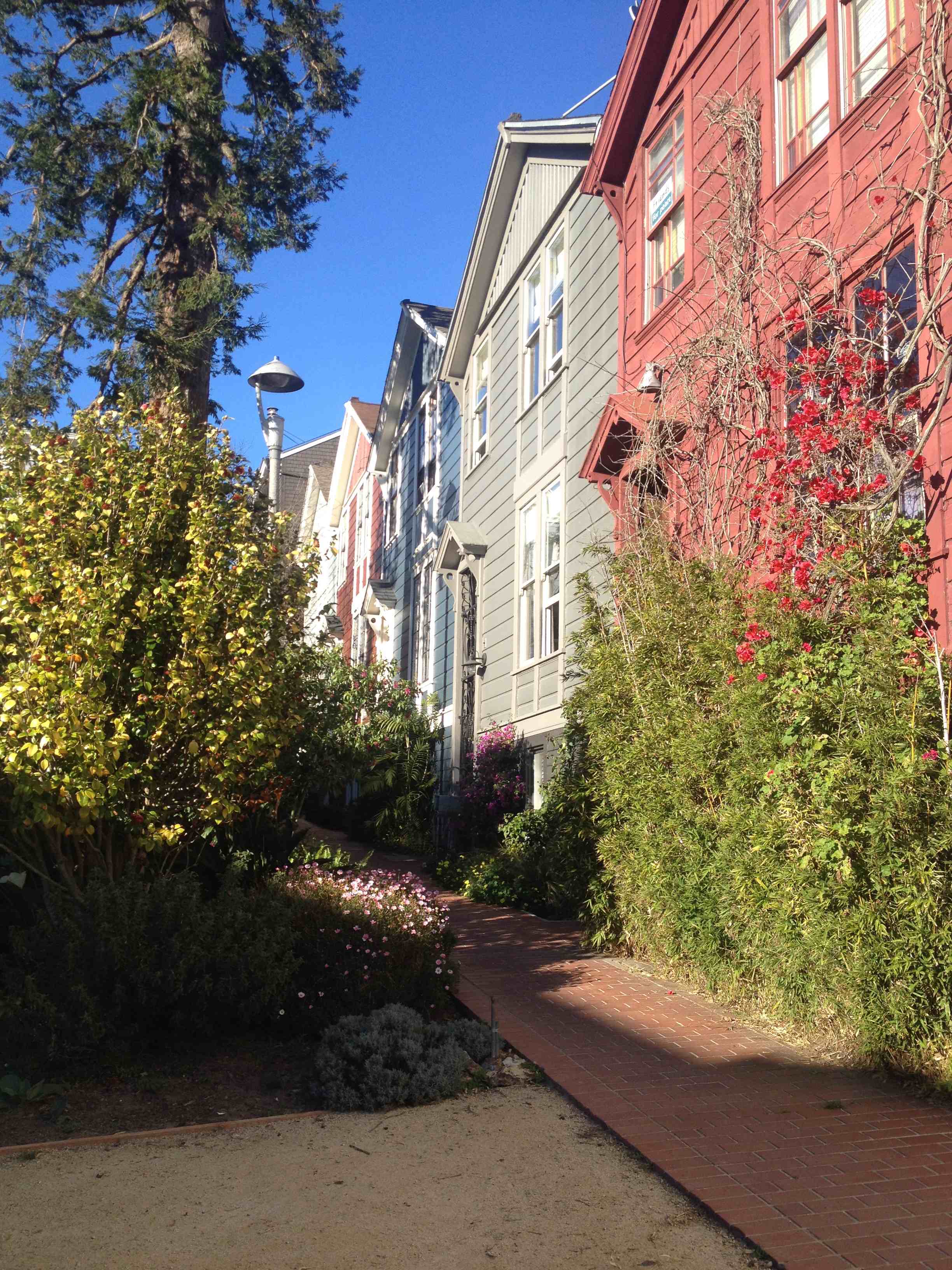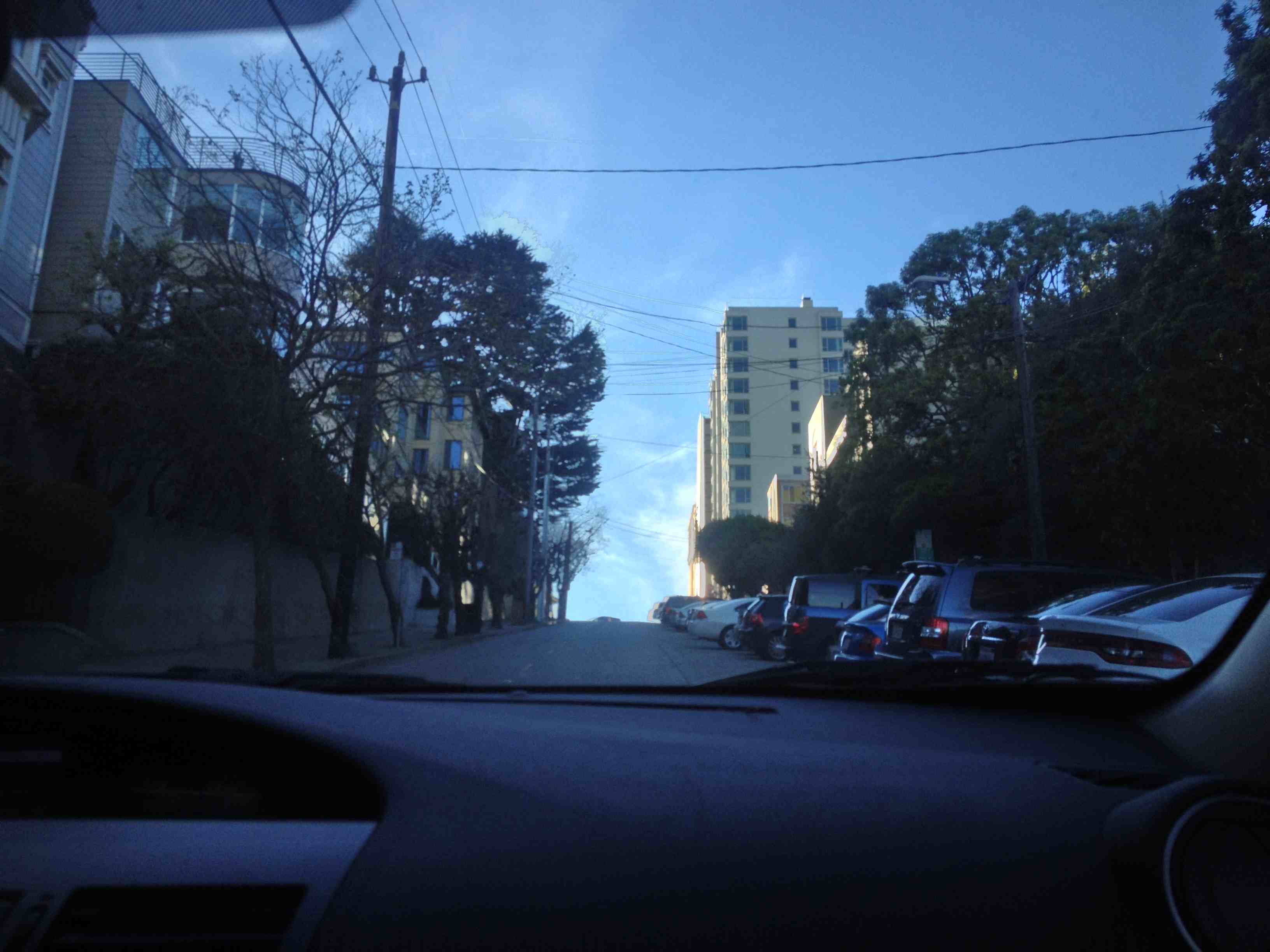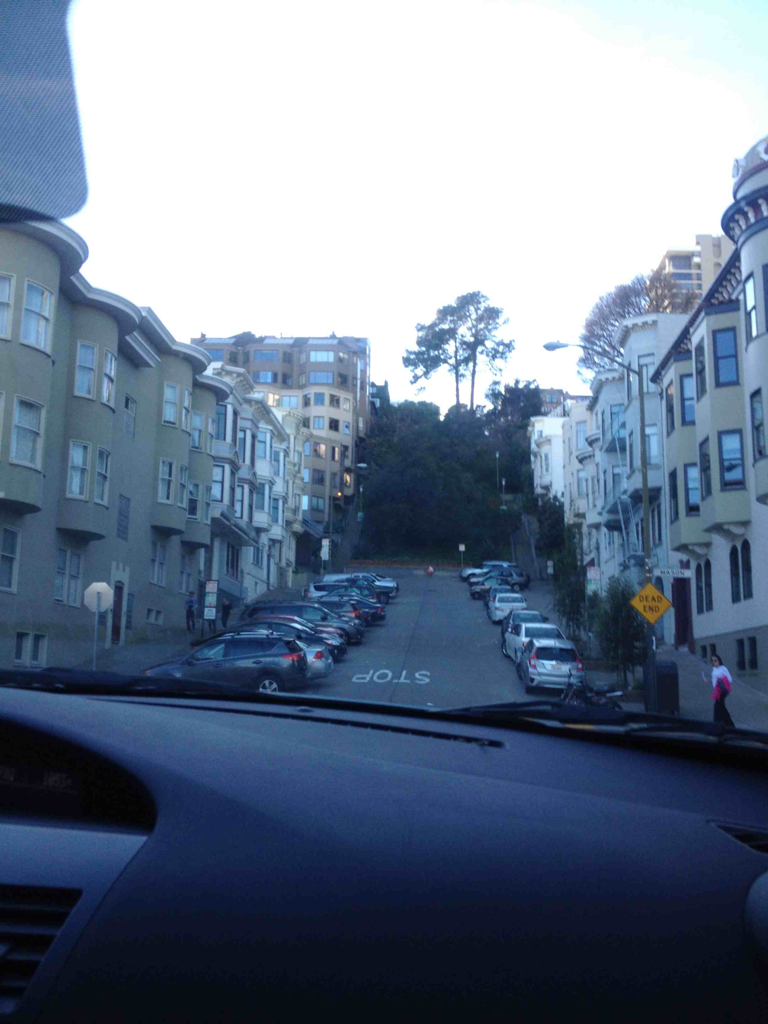 San Francisco, bien évidemment est aussi connue pour ses montagnes russes : la ville est toute en pentes plus abruptes les unes que les autres (le maximum est une pente à 35% - en France on nous dit de se servir du frein moteur à partir de 5% je crois). Chaque intersection (après chaque bloc d'immeubles) étant marquée d'un stop ou d'un feu rouge que l'on soit en montée ou en descente, je ne saurais vous conférer le soulagement qu'il y a à conduire une voiture automatique : elle fait le démarrage en côte à votre place ! Sinon, si je ne mourais pas avant, je serais devenue la pro du démarrage en côte au bout de trois jours de conduite à SF. C'est vraiment impressionnant.