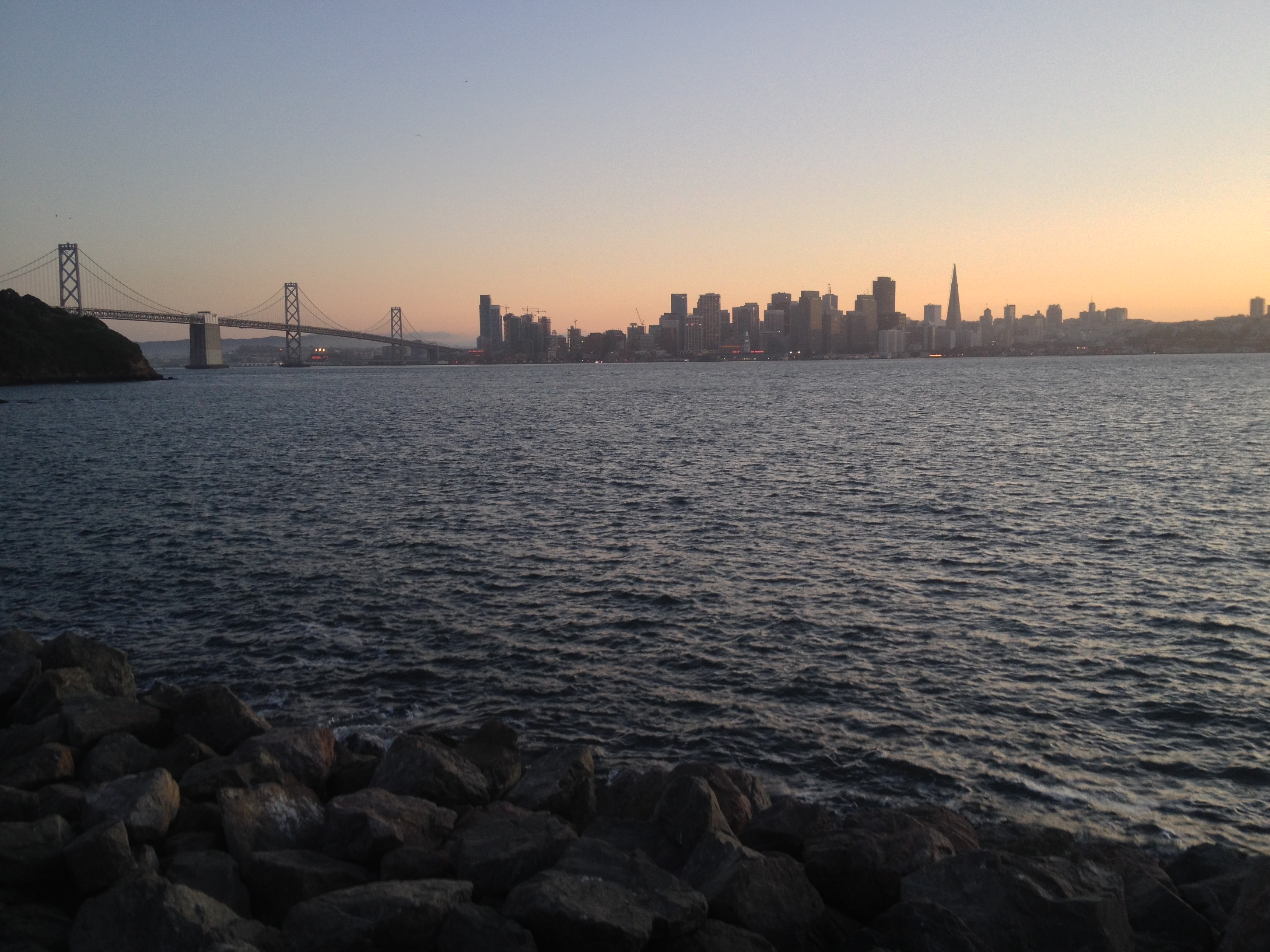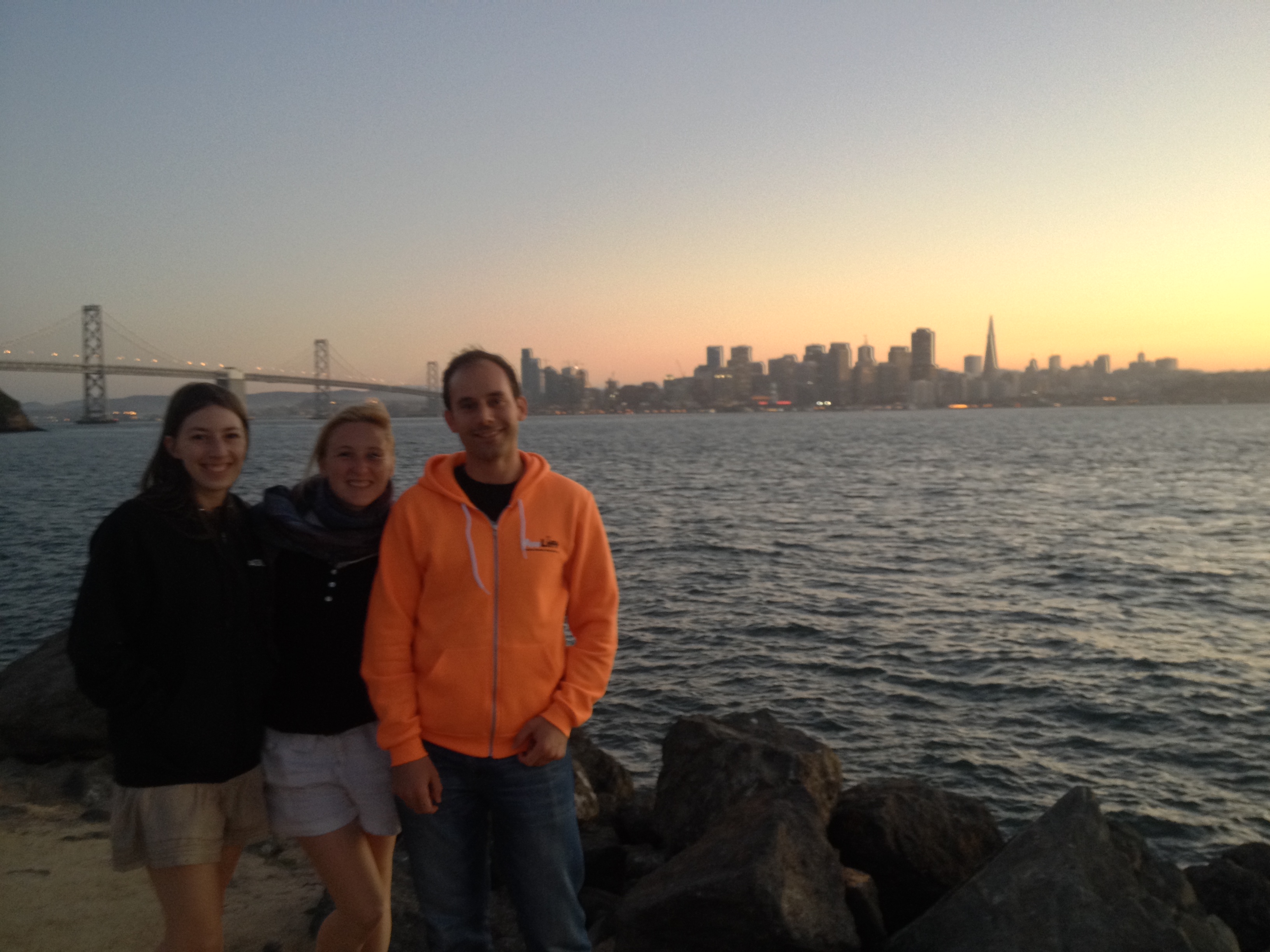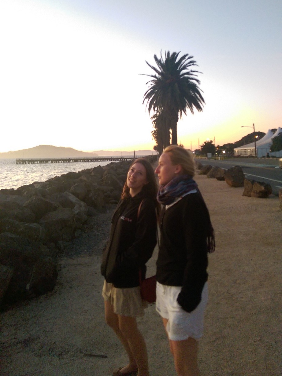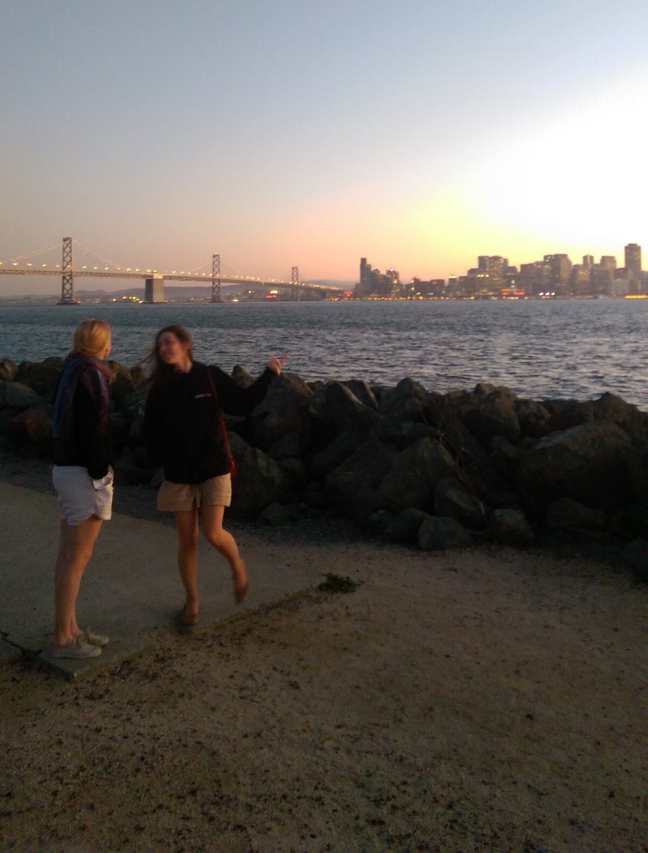 Le soir, elle fut présentée comme il se doit à la grand rue de Palo Alto, au sauna, au voisin et au Dutch Goose. A SF nous fîmes ensemble la connaissance de charmants jeunes américains éméchés dans un bar avant d'aller contempler le coucher de soleil sur San Francisco, le Bay Bridge et le Golden Gate Bridge depuis Treasure Island, une île construite en 1939 en plein milieu de la baie et jouissant d'une vue spectaculaire. Nous errâmes sur l'embarcadère pour aller manger des fruits de mer et participâmes à une soirée jacuzzi/barbecue sur la terrasse du bureau d'A comme il se doit.