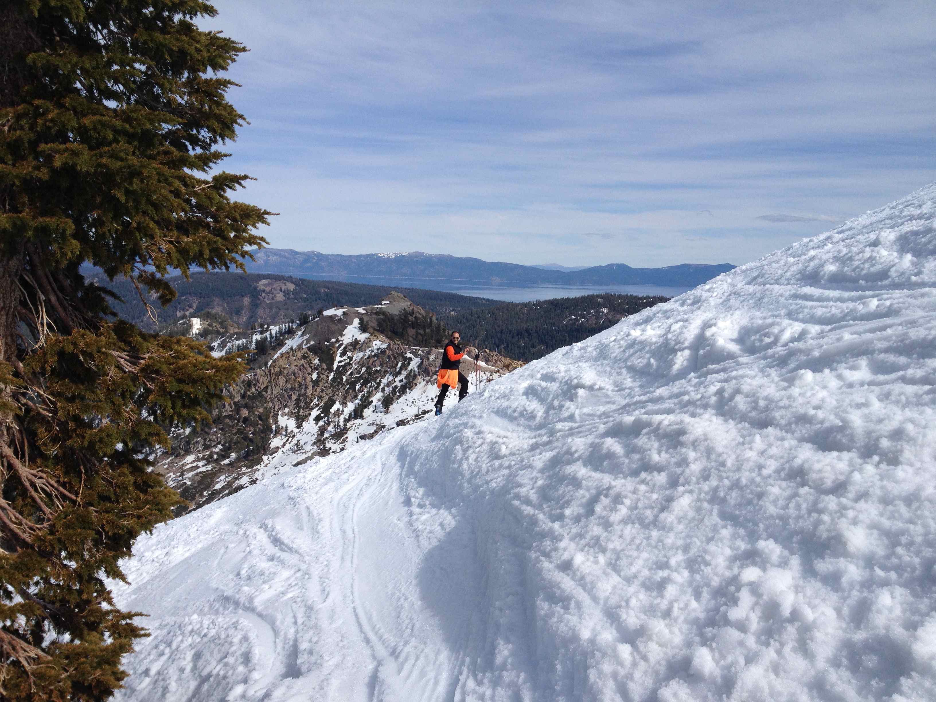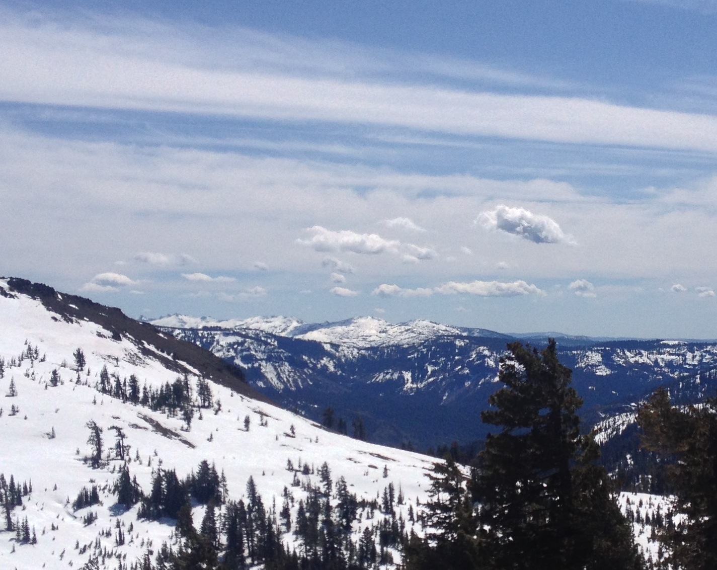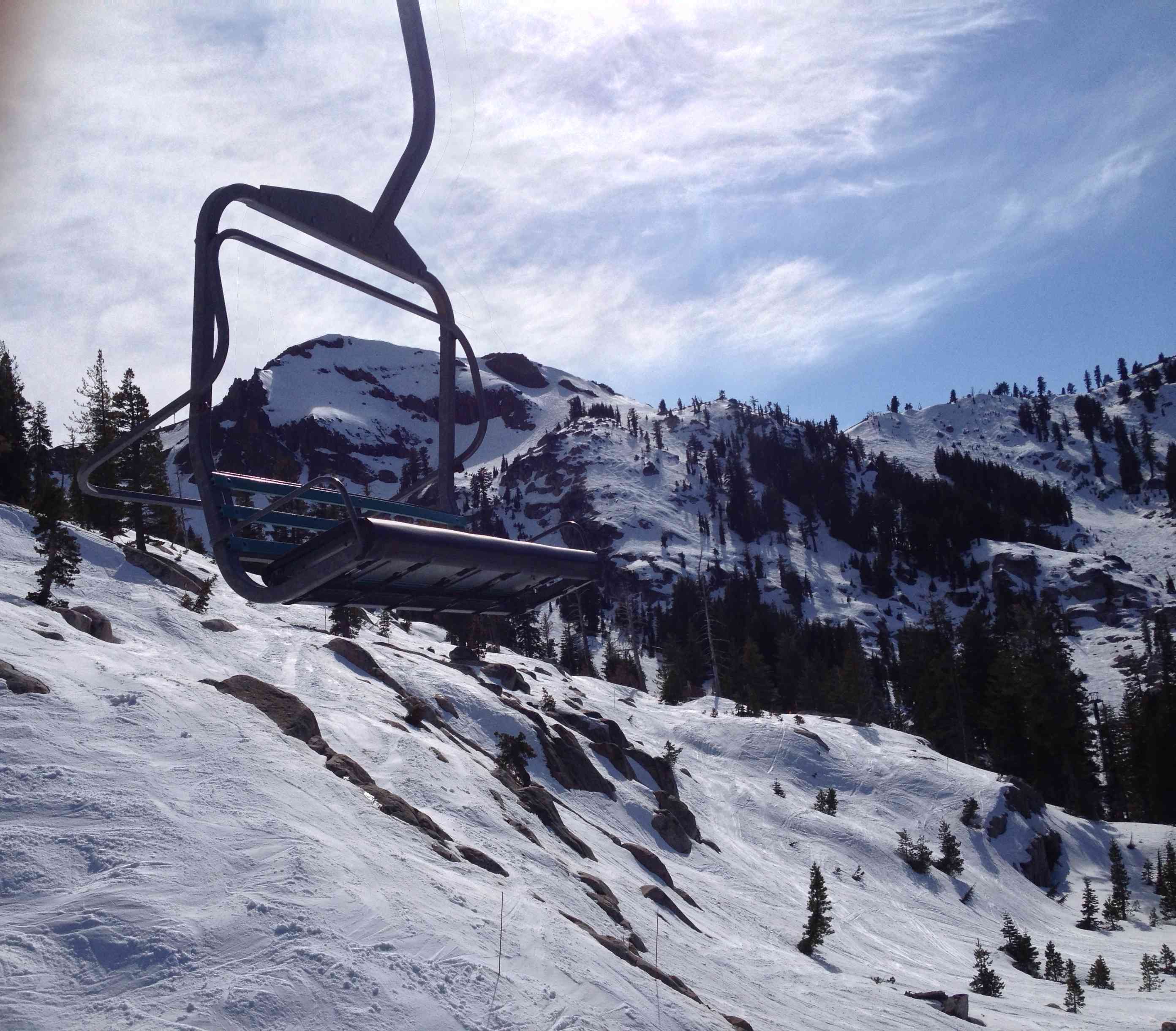 Aux aurores zénithales, alors que mes collègues les moins chanceux n'avaient pas encore éclos de leurs sacs de couchage sur les canapés, nous filâmes à Squaw Valley enfiler des combinaisons et chausser des skis avant de nous élancer sur les pistes ! La neige n'ayant pas été au rendez-vous cette année et la saison étant avancée, seule la moitié du domaine était ouverte. Il n'y avait pas grand monde et, finalement, la neige n'était pas si mauvaise. Certes, le duvet floconneux était un peu épars par endroits (j'ai dû déchausser pour traverser une langue de terre en redescendant) mais il y avait de quoi s'amuser sur l'ubac.